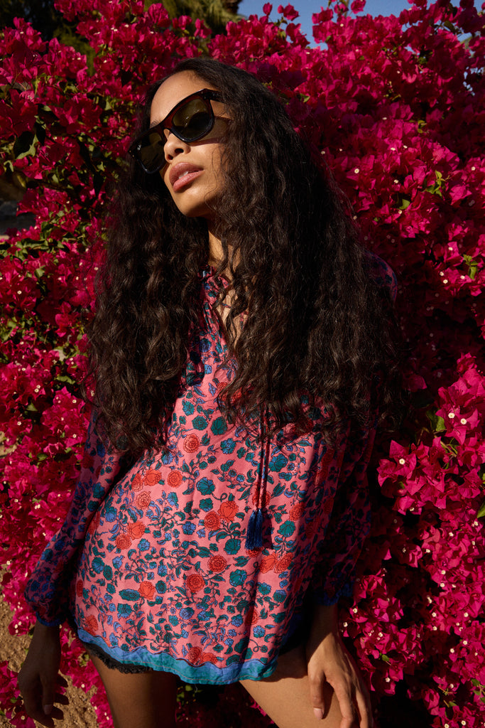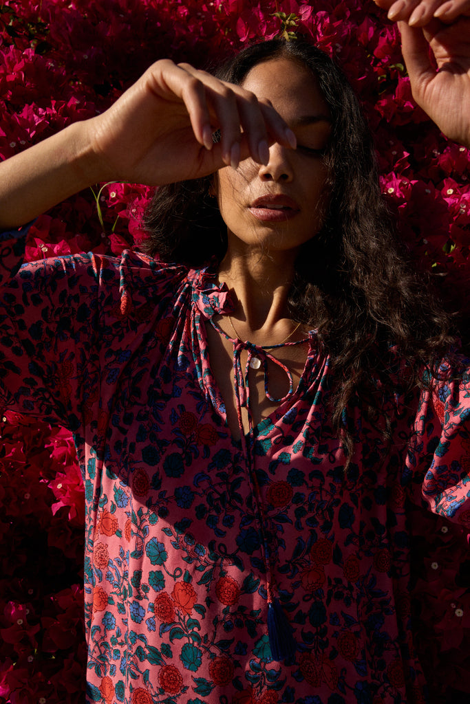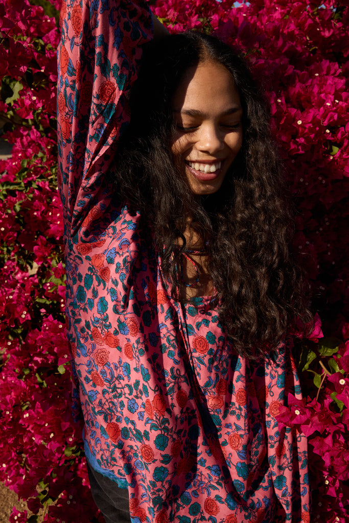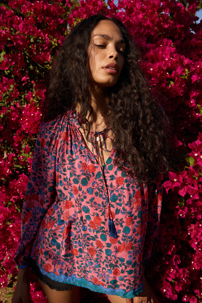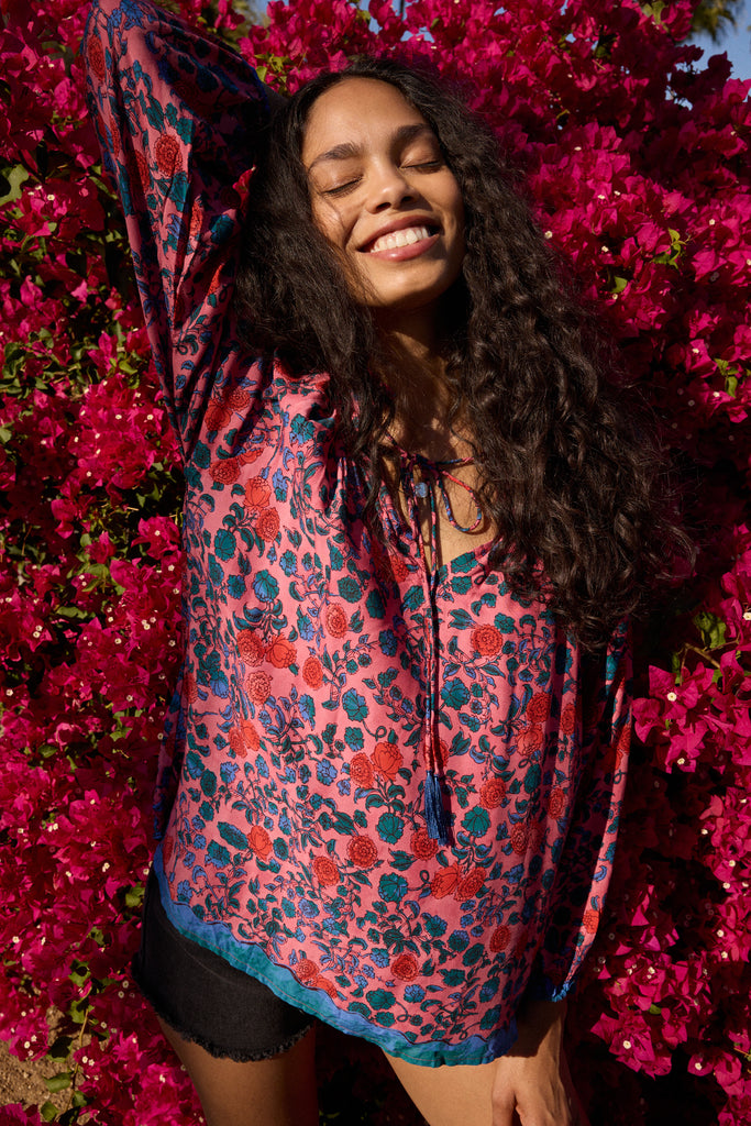 Flowy blouse with voluminous sleeves and button closure at wrist.