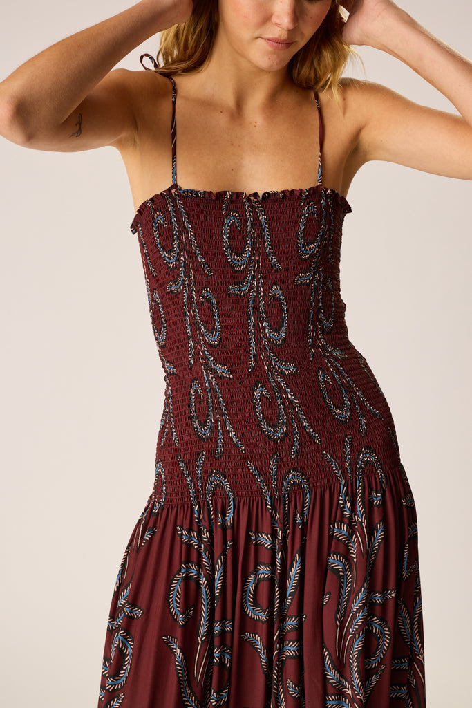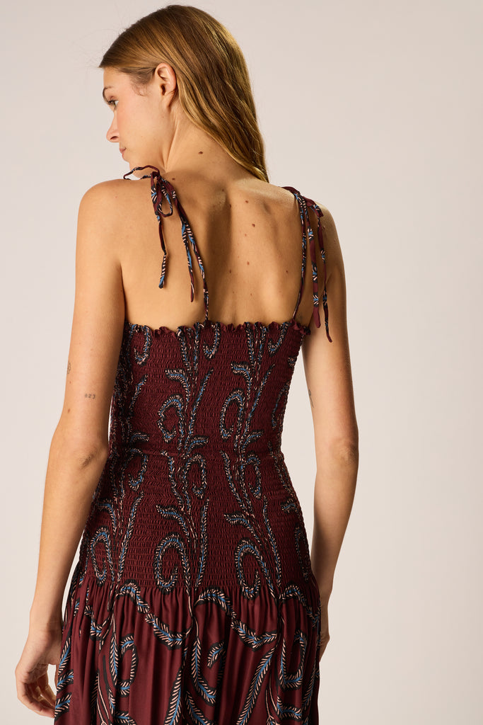 Maxi dress with an smocked bodice down to the hips, flounce hem, and tie-adjustable straps.
