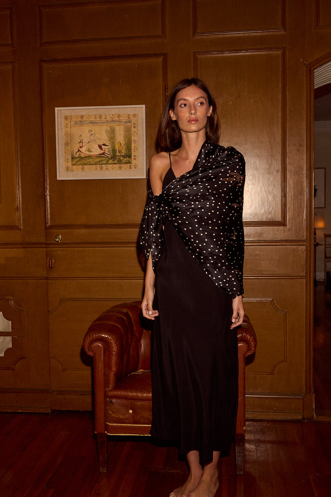 Full-length slip dress with adjustable shoulder ties and a straight V neckline. Relaxed fit with clean lines and minimal detailing.