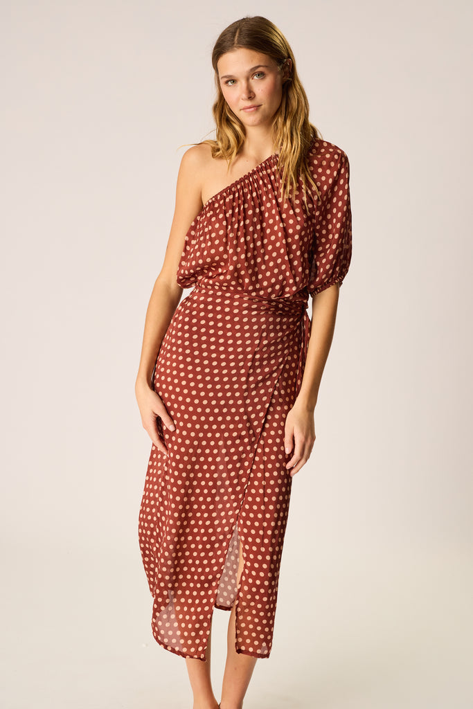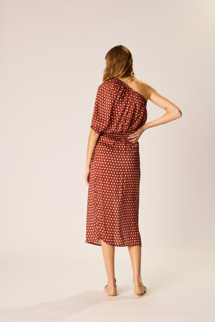 Our Erin top is a one shoulder style with an elastic neck detailing.