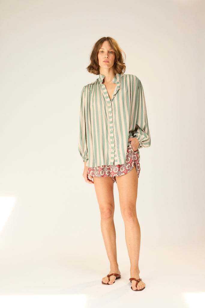 Long sleeve shirt with thick band collar and double button neck closure.