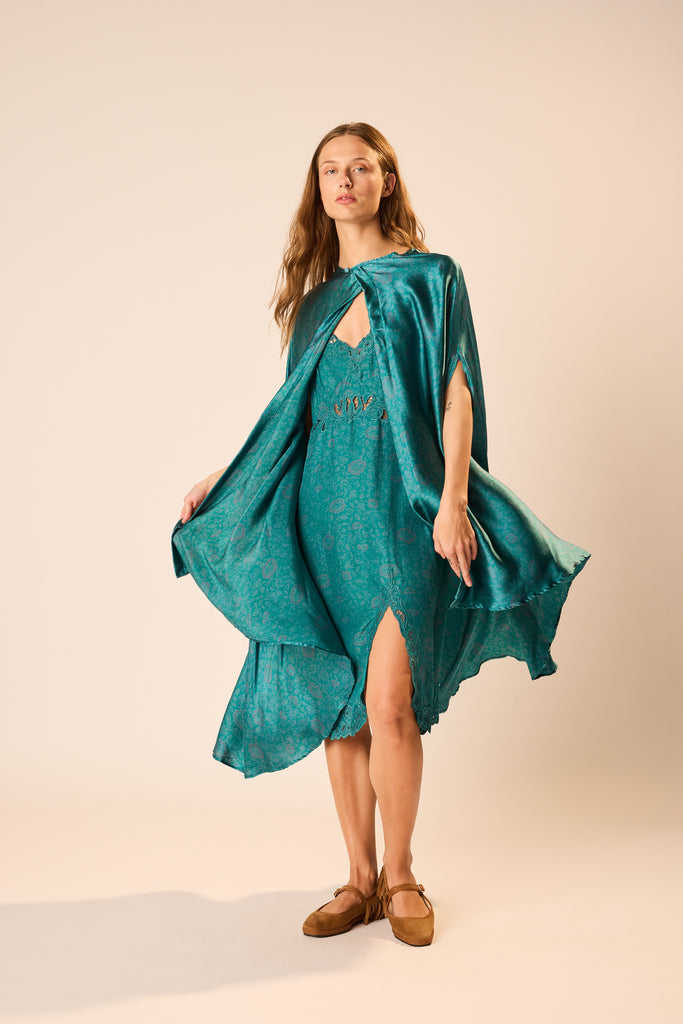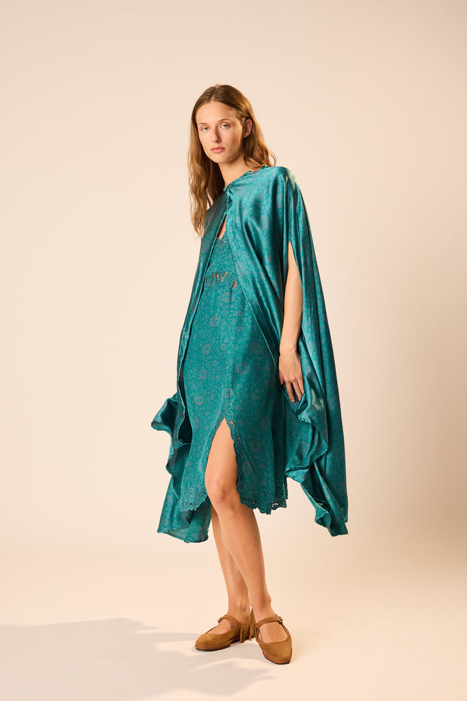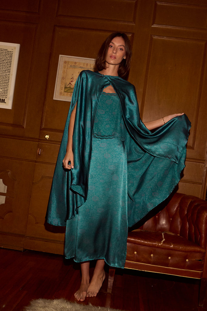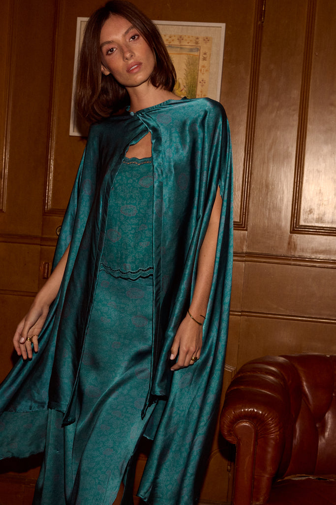 Hand wash in cold water and line dry. Dry cleaning also recommended./Users/jenniferalthousemaguire/Natalie Martin Dropbox/NATALIE MARTIN/SEASON PS26/PS26 IMAGES/PS26 STUDIO IMAGES/PS26 Full Body Jpgs/Karis Long Cape - NM Heritage Floral Opal/NM_PS26_FullBody_2210.jpg