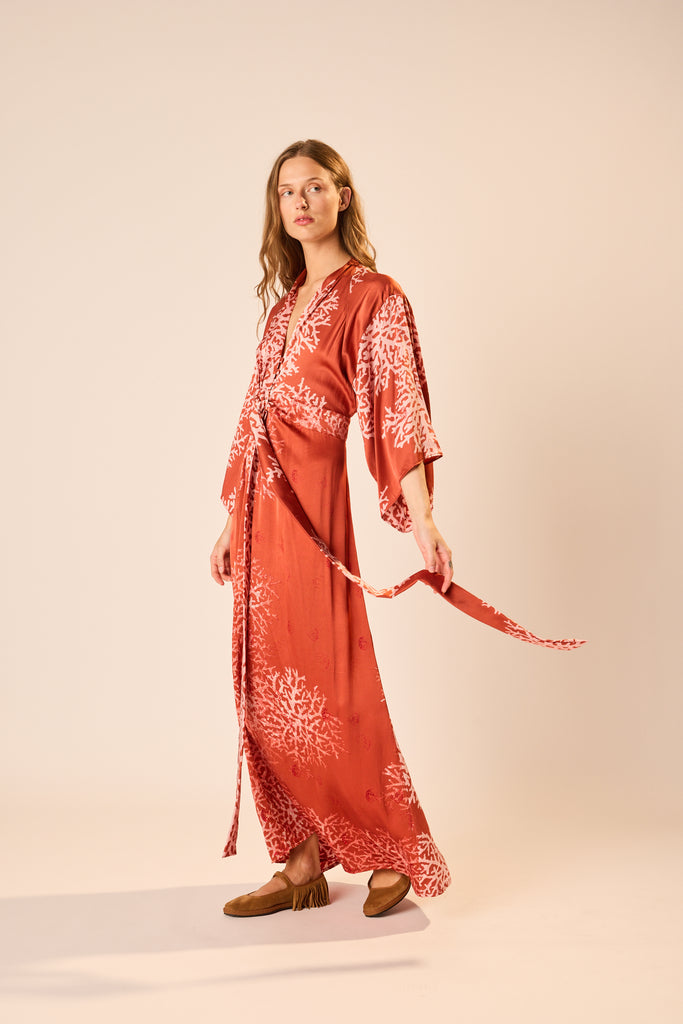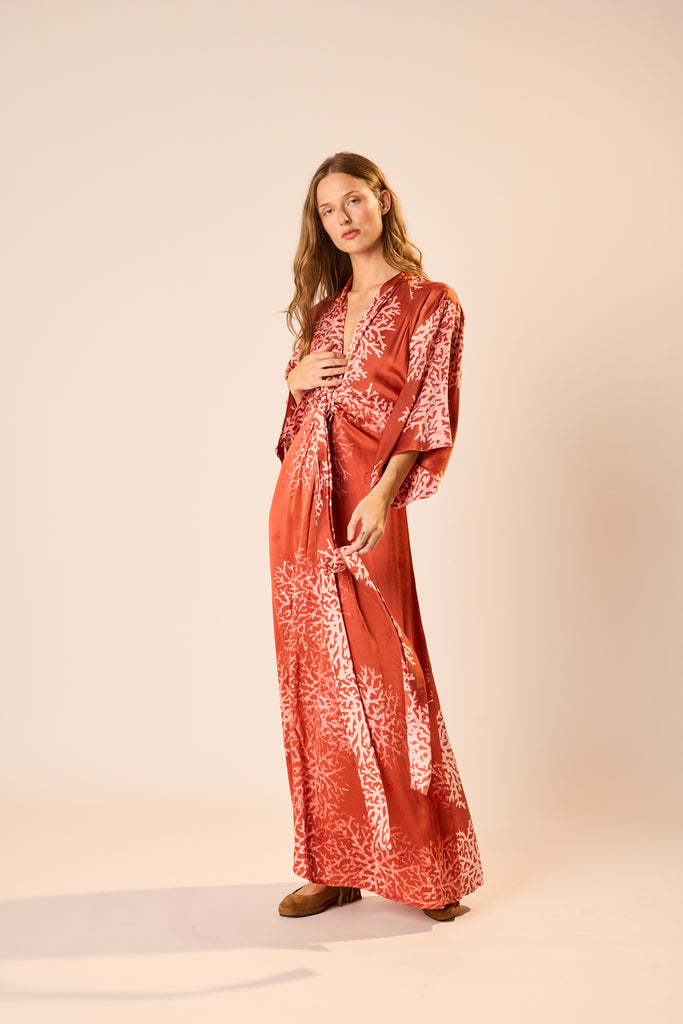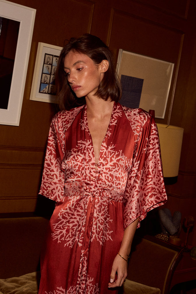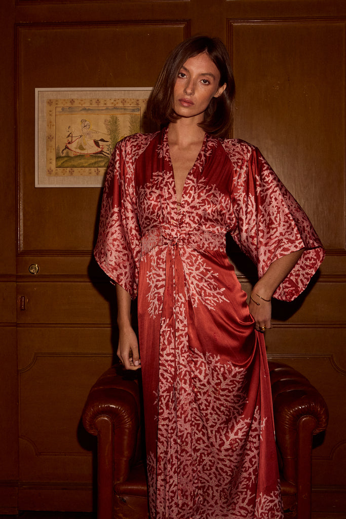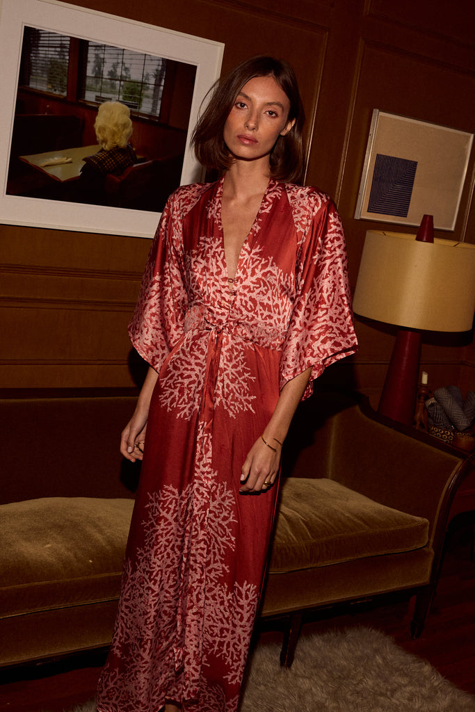 Crafted of silk, this kimono style-dress features a plunging V-neck, billowing elbow length sleeves, and a concealed front-zip closure. Knot or wrap the long silk ties for an ultra-feminine gathered silhouette.